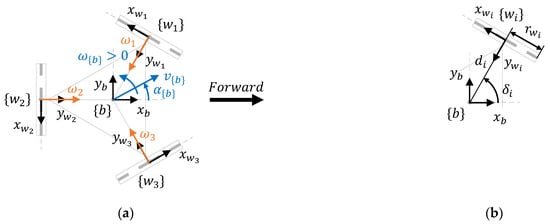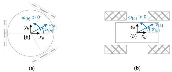 Representation of the motion command, , defined in the mobile robot frame of a mobile platform: (a) top-view of a robot using three optimal omni wheels; (b) top-view of a robot using four mecanum wheels. The free rollers of the wheels that are in contact with the floor are represented with wider lines.
