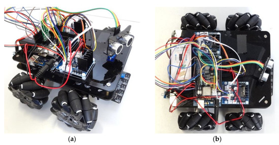 The reference omnidirectional mobile robot using four mecanum omnidirectional wheels was the OSOYOO ZZ012318MC kit for Arduino Mega [55]. Figure 5a shows the mobile robot, and Figure 5b details its omnidirectional motion system using four mecanum wheels that include passive rollers with a rolling direction oriented at ±45° relative to the wheel axis. This do-it-yourself (DIY) mobile robot is used as a rapid test tool of motion algorithms. Dhanasekar et al. [56] used this tool to evaluate the efficacy of a software-based monitoring solution proposed to reduce accidents in roadway settings where human-driven and autonomous cars are integrated. Bajracharya et al. [57] analyzed the use of different learning kits in education. Almassri et al. [58] developed an artificial neural network (ANN) to combine measurements from inertial measurement units (IMUs) and time-of-flight (TOF) measurements from an ultra-wideband (UWB) system with OptiTrack Motion Capture System (OptiT-MCS) data to guarantee the positioning accuracy of the mobile robot in indoor environments. Georgeon et al. [59] analyzed the self-localization problem and the active inference of obstacle properties using coarse sensors.