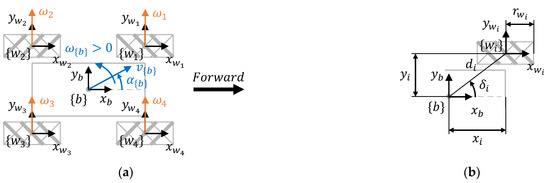 In Equation (2), and are the same for all the wheels and always positive. Alternatively, the coordinates of the center of each wheel can be expressed using and as follows: