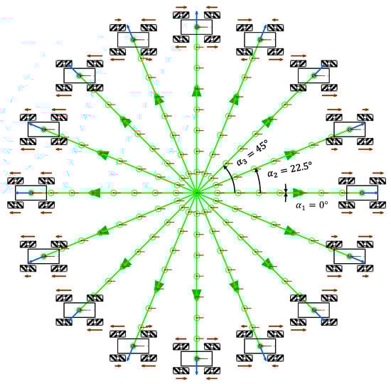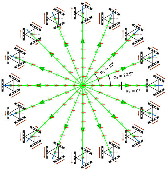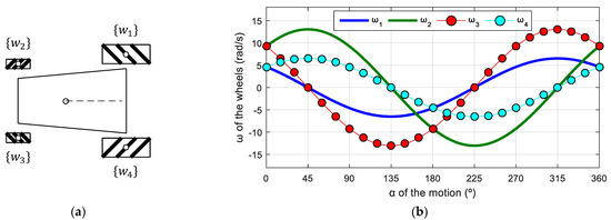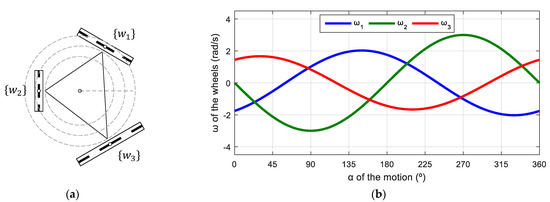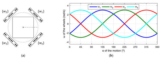 Figure 19b shows the target angular velocities of this mobile robot as a function of the angular orientation defined in a specific target motion command . The application of the phasor-like notation (Equations (12), (20), and (21)) to this mobile robot design generates the following model: