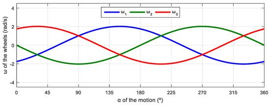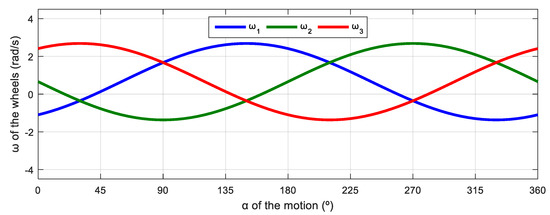 The evolution of the angular velocity of the wheels displayed in Figure 10 maintains the characteristic 120° phase difference between signals previously observed in Figure 8, which is characteristic of a three-phase electrical circuit. A detailed comparison of the results from Figure 8 and Figure 10 reveals that the signals maintain the same phase difference between them and the same sinusoidal amplitude. The results also show that there is a shift in the mean value of the angular velocities represented, which was 0 in the previous case with = 0 rad/s (Figure 8) but has a nonzero value in the current case with = 0.5 rad/s (Figure 10).