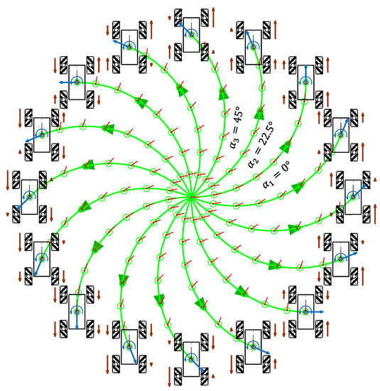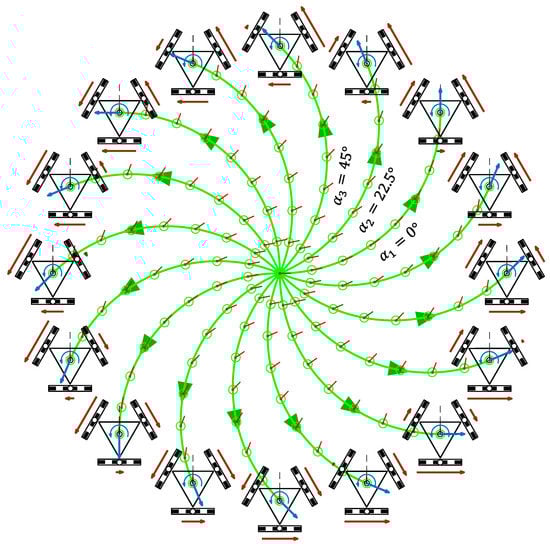 Once more, the translational velocity was = 0.3 m/s, the duration of the motion was 15.7 s, the displacement covered 4.71 m, and the angular velocity of the robot was = 0.1 rad/s. Consequently, the mobile robot rotated during this motion [14], and its final orientation was (/2 rad). This simulation was also defined in steps of , and only the angular orientations corresponding to = 0°, = 22.5°, and = 45° are labeled in Figure 13 to reduce the information displayed. Similarly, the simulation time and the length of the trajectories were limited for improved visual interpretation of the results.