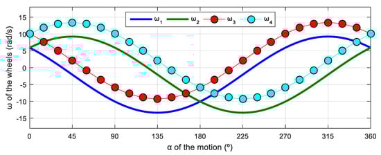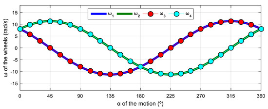 The evolution of the angular velocity of the wheels displayed in Figure 14 maintains the phase difference between signals of 270° previously observed in Figure 12. Apparently, this phase difference is characteristic of a four-wheeled mecanum omnidirectional mobile robot. Similarly to the three-wheeled case, the comparison of the results from Figure 12 and Figure 14 reveals that the signals maintain the same phase difference between them and the same sinusoidal amplitude. As in the three-wheeled omni robot, there is a shift in the mean value of the angular velocities represented, which was 0 in the previous case with = 0 rad/s (Figure 12) but has a nonzero value with = 0.5 rad/s in this case (Figure 14).