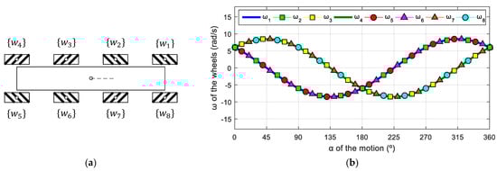 Symmetric eight-wheeled mecanum mobile robot: (a) schematic top-view representation; (b) profile of the angular velocities of the wheels for v = 0.3 m/s and = 0 rad/s.