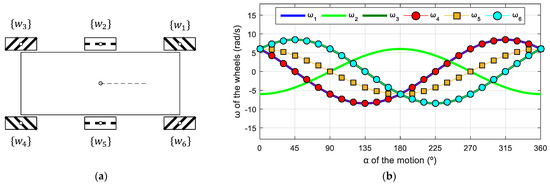 Hybrid six-wheeled omnidirectional mobile robot: (a) schematic top-view representation; (b) profile of the angular velocities of the wheels for v = 0.3 m/s and = 0 rad/s.