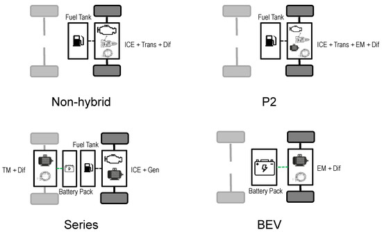 - Kim, D.-M.; Benoliel, P.; Kim, D.-K.; Lee, T.H.; Park, J.W.; Hong, J.-P. Framework Development of Series Hybrid Powertrain Design for Heavy-Duty Vehicle Considering Driving Conditions. IEEE Trans. Veh. Technol. 2019, 68, 6468–6480. [Google Scholar] [CrossRef]