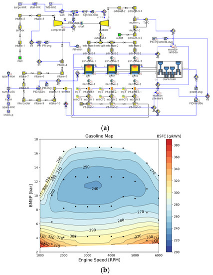 Internal combustion engine model in GT-Suite (a) and the brake-specific fuel consumption map (b).