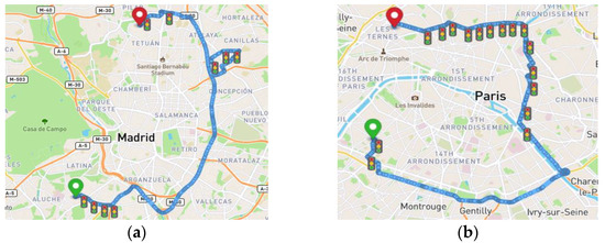Moreover, the customize urban cycles are obtained with the GT-RealDrive tool, a plugin in GT-Suite that allows us to obtain the vehicle speed and altitude values versus time by imposing the start/finish targets. The virtual navigator software includes traffic lights, start/stop dynamics, and traffic data by using the costumer’s database. Figure 4 shows a schematic illustration of the route in the two different European cities that were considered to explore the vehicle’s behaviour (Madrid and Paris). The cycles were previously used in a work of the research group and more details can be found in [21].