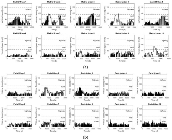 Madrid (a) and Paris (b) ten urban driving cycles obtained with GT-Real Drive tool. Adapted from [21].