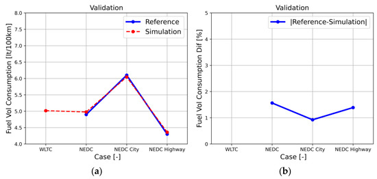 Overall fuel consumption (a) and percentage difference between reference data and simulations (b) for the non-hybrid configuration.
