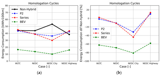 Homologation driving cycles comparison in terms of energy consumption (a) and difference versus non-hybrid (b).