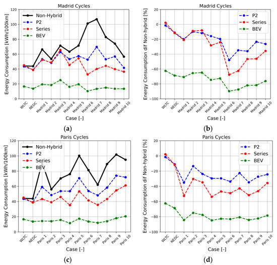 Urban cycles comparison in terms of energy consumption (a,c) and difference versus non-hybrid (b,d) in Madrid and Paris.
