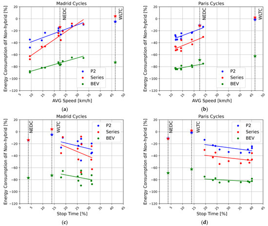 Average cycle speed and stop time were considered as the main parameters to be analysed with respect to energy consumption in Figure 9; this is because they can be directly related to powertrain efficiency (ICE operating point and recovered energy in braking events). Figure 9a,b shows less evident energy consumption reduction when the driving cycle average speed increases. In addition, the results for the three powertrains correlate well with a line. For both cities, the Series hybrid shows more dependence with the average speed compared to the BEV and P2 hybrid. This can be explained by the fact that when the speed increases, the ICE needs to be turned on for longer periods of time and the effects of the liquid-electricity-propulsive power conversion chain are more evident. On the other hand, the P2 can directly act on the wheels without the need for intermediately converting the energy in electricity. The BEV featured a quite flat trend for all conditions, as expected.