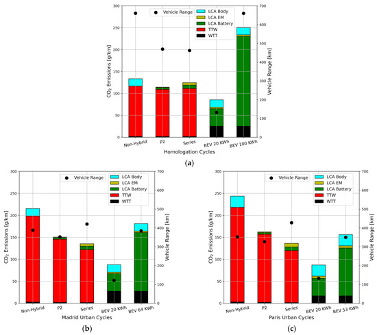 LCA for homologation cycles (NEDC and WLTC) (a), Madrid urban (b), and Paris urban (c) cycles in terms of average CO2 emissions; separate categories are also highlighted.