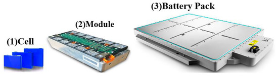 Illustrative example of packaging for a high-power automotive traction battery with a prismatic lithium-ion cell package (1). Multiple prismatic cells are combined to create modules (2), which are further integrated with a battery management system, thermal management systems, and electronic components to form a complete battery pack (3).