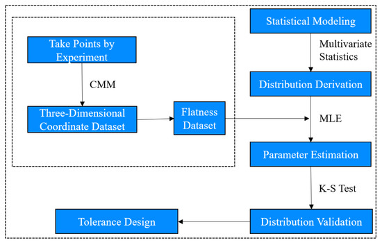This investigation primarily focuses on the flatness distribution. A flowchart to study the form of the distribution is shown in Figure 2. Form tolerances typically define a designated area in which a consideration plane, line, axis, or center plane should be located. In accordance with the measurement standard [26], flatness tolerance specifies that all points on the surface must fall within the regions defined by two parallel planes. Specifically, the tolerance value represents the distance between these two parallel planes.
