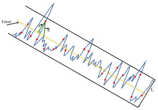 In practical applications, a limited number of coordinate points on the plane are measured to determine the flatness value. It is necessary for all measurement points to fall within the specified area defined by the measurement criteria. The measurement of flatness can be represented by the distance between two parallel planes that contain all the measurement points. One effective approach to meet this requirement is to fit the set of measurement points with a regression plane and calculate the flatness using the residual. Figure 3 provides a visual representation of this concept, depicting a cross-section of a panel. In the figure, the symbol represents the region enclosing the fitting plane, and it indicates the distance between the parallel planes that enclose all the measurement points. The symbol represents the distance between the measurement point and the fitting plane. The symbol represents the vertical distance between the measurement point and the horizontal plane. The dots represent the set of points taken during measurement. The blue line represents the actual shape of the plane. The yellow line represents the fitted plane. Mathematically, it is feasible to evaluate the flatness distribution by the LSM. This method has excellent premise assumptions: