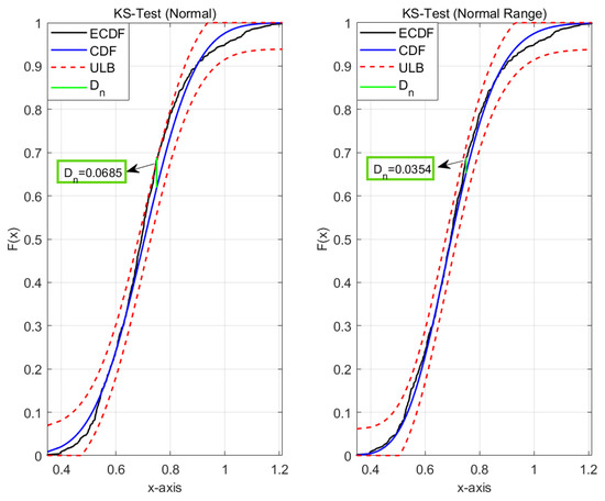 When is calculated from observations, will be rejected; otherwise, accept the hypothesis. Figure 5 is a KS test chart of normal distribution and normal range distribution for a measurement data group, respectively, where and . The KS test value of the normal distribution is 0.0685 (p-value = 0.01842 < 0.05), which means that the null hypothesis is rejected, and the data do not obey the normal distribution.