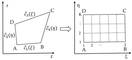 Coordinate transformation from irregular physical (r–z) domain (left) to regular computational (ξ–η) domain (right).