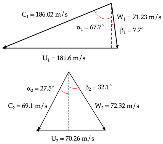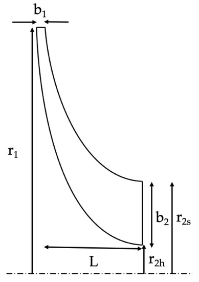 where is the static enthalpy, is the relative velocity, is the blade speed, and is the rotational speed. The inlet rothalpy can be calculated based on the inlet total enthalpy and the inlet value. The total enthalpy value and static enthalpy at other locations rather than the inlet can be calculated from the constant rothalpy value I and known or relative velocity at that location. Using the known entropy and enthalpy () with REFPROP or CoolProp, other fluid properties, including density , pressure and temperature , at any location can be obtained. It should be noted that all the properties discussed in this section are circumferentially averaged values, which means they are functions of and . The static enthalpy jump across the blade can be calculated from Equation (50).