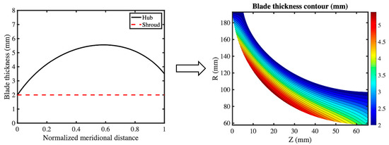 where is the tangential thickness distribution for the blade and B is the blade number. The relation between the blade’s normal thickness and the tangential thickness is defined by Equation (27). It is more common to directly define the blade’s normal thickness for stress considerations.