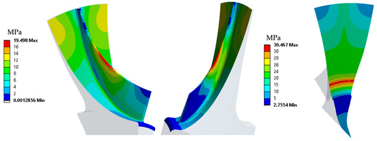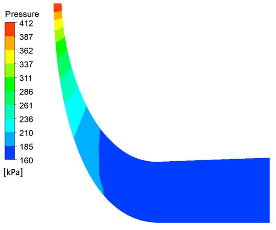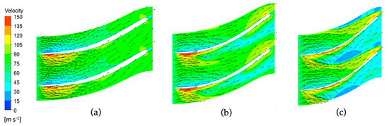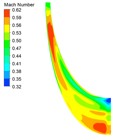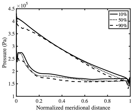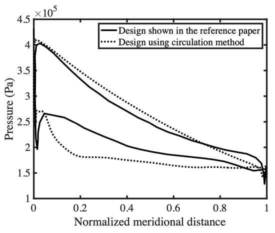 where is the static enthalpy on the blade pressure surface, is the static enthalpy on the blade suction surface and is the mean blade surface velocity. The mean static enthalpy is known, and it is equal to the mean of and . Using Equations (50) and (51), and can be obtained. Similarly, using the constant entropy, the blade surface pressures (static pressure on the pressure surface) and (static pressure on the suction surface) will be obtained.