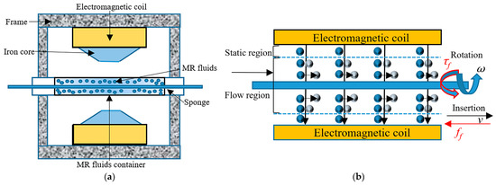 The leader manipulator is in direct contact with the surgeon’s hands. It can provide PFF to the surgeon’s hand. PFF is realized via the magnetorheological (MR) fluids (MRF-122EG, Lord Crop., Cary, NC, USA) in the container, as shown in Figure 2 [38,47]. MR fluids are intelligent materials and were used as controllable fluids to mimic the compressional compliance of biological tissues to realize a haptic display. The material properties of MR fluids can be expressed as: