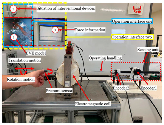 The technical parameters of the leader haptic device are shown in Table 4. As shown in Figure 3, the surgeon manipulates the operating handling device to control the movement of the guidewire/catheter on the follower side. The movement information of the operating handling device is collected by two encoders (MES020-2000p, MTL, Sagamihara, Japan). Based on the leader manipulator, two operation interfaces were integrated and formed into the leader side. Operation interface one can view the movement status of the guidewire/catheter in the endovascular evaluator (EVE) model and the situation of the follower manipulator controlling the guidewire/catheter through IP cameras. Operation interface two can view the force information of the moving guidewire/catheter (vision-based force feedback) based on operation interface one.