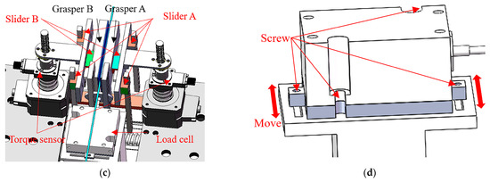 Follower manipulator with force detection structure. (a) Simple schematic diagram of the follower manipulator–controlling guidewire/catheter movement principle; (b) schematic diagram of the follower manipulator (including the shell); (c) schematic diagram of force detection; (d) schematic diagram of adjustable load cell installation.