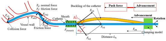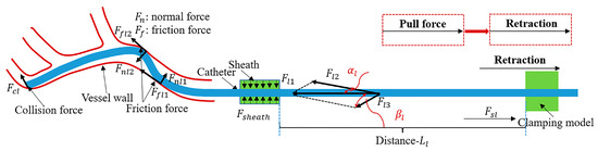 The actual blood vessel situation is much more intricate than in Figure 5. However, in general, compared with the previous analyses [53,54], the forces on the catheter can be expressed by the following equations: