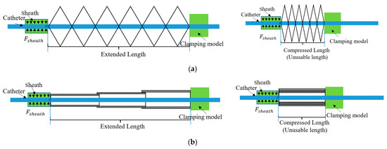 For method 1, these methods [55,58,59,60,61,62,63,64,65] passively support mechanisms for buckling prevention. The active feeding mechanism [66] adopts an active method to carry out buckling prevention of the catheter. Its straightforward method uses the catheter-driving unit and feeder mechanism to operate synchronously. This anti-buckling structure design causes the curved catheter to come into contact with it and causes some friction. For systems with PFF, introducing this friction will threaten the accuracy and effectiveness of PFF [50]. As shown in Figure 6, when fully compressed, there will be a certain amount of the catheter that cannot be used. The design of the anti-buckling structure reduces the effective stroke of the catheter to a certain extent, which is inevitable. Standard catheters are expensive, and their length is limited. Therefore, introducing this anti-buckling structure is not conducive to the full use of the effective length of the catheter, resulting in a waste of some resources. The design of the anti-buckling systems brings a certain degree of redundancy to the system, which is not conducive to the flexible manipulation and rapid replacement of the catheter. These anti-buckling systems increase the part count and size and are inconvenient to place near a patient due to their bulky structures [66]. In addition, it is also necessary to consider the issues of disinfection and infection [56,57] and whether these anti-buckling structures affect the catheter’s movement (translation and rotation) [66].