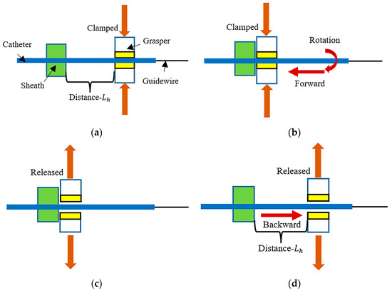 A schematic diagram of the reciprocating manipulation method. (a) “clamp”—the grasper is positioned at a distance from the sheath, and at the initial position, the grasper clamps the catheter; (b) “forward (rotation)”—the grasper clamps the catheter for forward or rotational movement until the position of the grasper reaches the position of the sheath; (c) “release”—after reaching the position of the sheath, the grasper releases the catheter; (d) “backward”—the grasper returns to its initial position.