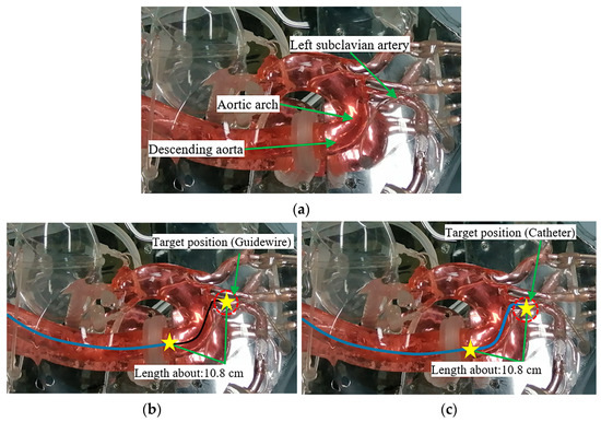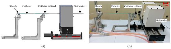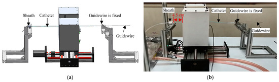 The experimental setup for part 1 is shown in Figure 9. The end of the catheter (SZ3502, MEDIKIT, Tokyo, Japan) is fixed. The catheter enters the EVE model through a sheath. The follower manipulator controls the guidewire (RF-GA35153, Terumo, Tokyo, Japan). Figure 9a shows the model diagram of the guidewire manipulation experiment. Figure 9b shows the guidewire manipulation experiment’s physical setup.