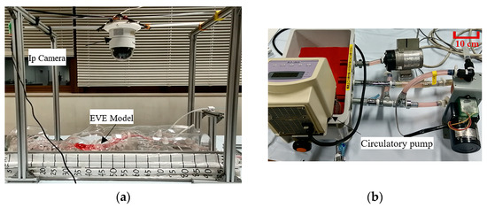 Experimental environment. (a) The EVE model and IP camera; (b) circulatory pump.