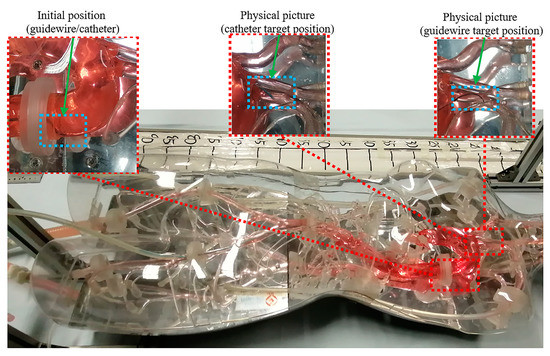 In order to better reflect the actual intervention process of the guidewire and create an actual operating environment, and to verify the actual control performance of the follower manipulator on the guidewire, the following experimental setup was designed. The design of the experimental setup mainly included two parts: (1) designing the experimental setup before entering the EVE model (Fain-biomedical, Nagoya, Japan); (2) designing the experimental environment in the EVE model.