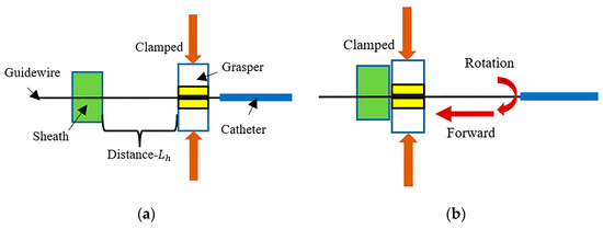 As shown in Figure 5, the distance from the clamping position of the follower manipulator to the sheath is . In the range of distance , due to the characteristics of the flexible material of the catheter itself, at this distance, the catheter cannot be guaranteed to be in a horizontal straight line (along the axial direction of the catheter). These factors cause the following phenomena to occur when advancing the catheter.