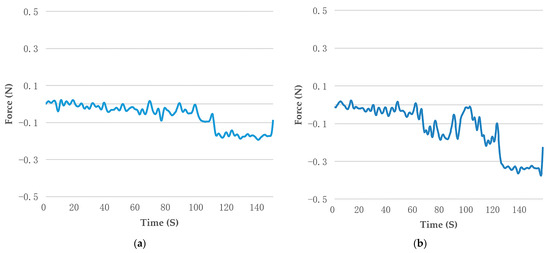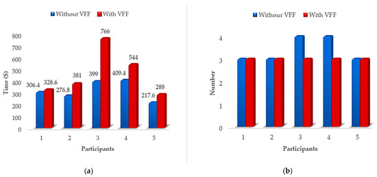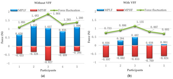 - From the perspective of the safety threshold, when the force exceeds the safety threshold, this will increase the potential safety risk of damaging the vessel wall; if the force fluctuation is below the safety threshold, the MPLF and MPHF have to be below the safety threshold; and as shown in Figure 18b, all participants’ MPLF and MPHF were below the safety threshold under the operation with VFF; therefore, this reciprocating manipulation method with VFF positively reduces the risk of damaging the vessel wall.