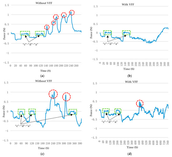 For the catheter experiments, as shown in Figure 17, the ““c”–”d”–”a”” process time is always different because this process is operated manually, and different participants may have different operation times. In this process, it needs to be repeated many times. So, this reciprocating manipulation process can be processed into an automation procedure. Therefore, this helps to reduce the surgeon’s burden and improve the system’s dexterity. In addition, for the follower manipulator, the developed structure for holding will be designed and integrated into the existing system. In this article, an assistant participant replaced the catheter’s holding function. Comparing the results of Figure 14 and Figure 17, the axial force on the guidewire is obviously smaller than that on the catheter. The reason for this can be found in Equations (4) and (9). Some forces in Equations (4) and (9) can be achieved via experiments or analytical models, which can be found in previous works [39,51]. As shown in Figure 18, the MPHF increased under the operation with VFF, which may be related to the radial force of the catheter. Therefore, this should be verified by experiments in the future. When under the operation with VFF, the participants always paid attention to the control of the rotation motion of the catheter.