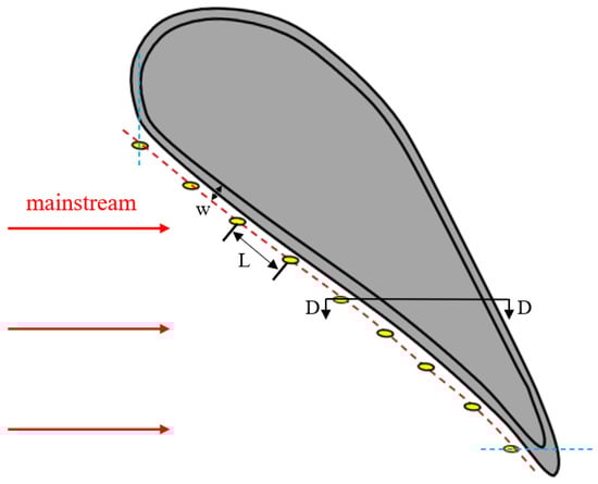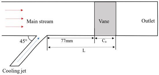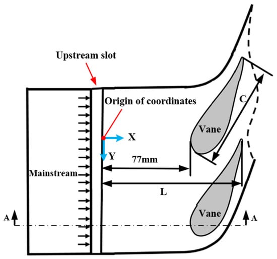 The vane profile studied in this paper is adopted from the experiments carried out by VirginiaTech University [20]. The linear cascade is obtained by stretching this vane profile. The slot located 77 mm upstream of the vane stagnation point has an injection angle of 45°. The coordinate system and top view of the model are depicted in Figure 1. L (370 mm) is defined as the distance between the trailing edge of the vane and the slot. The layout of the cooling structure and vane profile are shown in Figure 2. Moreover, to study the impact of the slot coolant more clearly, the film holes near the leading edge are removed. The boundary conditions and specific geometric parameters of the simulation are displayed in Table 1.