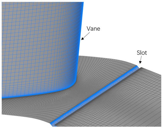 The ANSYS CFX was employed to solve the steady Reynolds-averaged Navier–Stokes (RANS) equations. Adiabatic non-slipping wall boundary and structured grids are adopted in the simulation. The gas in the simulation is set as ideal gas. To guarantee the orthogonality of the grids, the O-type grid is used for the regions around the vane surface. To accurately predict the wall heat transfer, the first cell thickness of the wall is refined to guarantee that the y+ values are smaller than 1.0. The intake section length is 0.75 times the length of the axial chord to generate a fully developed boundary layer flow. To prevent backflow, the outlet section’s length is 1.2 times the length of the axial chord length. The grids adopted in the computation are displayed in Figure 3. To achieve the specified mass flow ratio, a mass flow inlet with a 45° injection angle with respect to the endwall was installed at the slot entry.