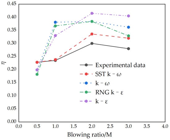 Using the same vane, references [9,21] both adopted the SST k–ω turbulence model. To guarantee the credibility of the predicted results, the numerical method was studied in ref. [21] by adopting four turbulence models (standard k–ε, RNG k–ε, standard k–ω, and SST k–ω turbulence models). For a blow ratio M of 0.3, Figure 4 presents a quantitative analysis of area-averaged (the region is shown in Figure 1) adiabatic cooling effectiveness for the experimental model. The blowing ratio (M) is defined as: