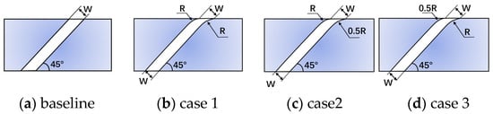 Due to the severe operating environment and the thermal loads that gas turbines withstand, upstream slot are susceptible to being rounded due to ablation and ash accumulation. Therefore, this section investigates the effect of slot fillet on endwall cooling performance. Figure 5 depicts the schematic of the slots with fillets in section A. The position of section A is shown in Figure 1. In Figure 5, R is 1% of the vane height, and W is set as 10 mm.