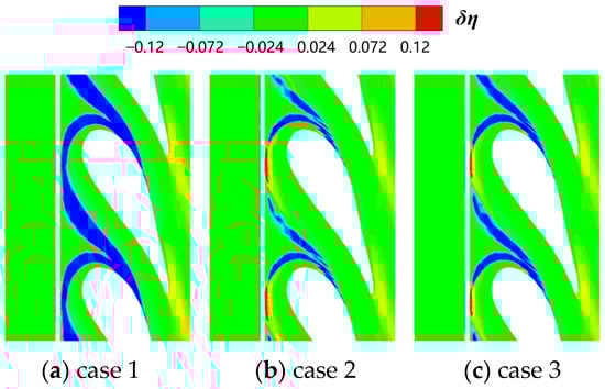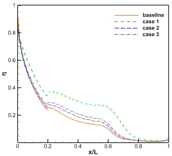 where is the local adiabatic cooling effectiveness and is the baseline corresponding adiabatic cooling effectiveness. Through comparison, in case 1, there is an obvious blue zone near the leading edge and the boundary of the coolant coverage region, indicating that the spread of the coolant is strengthened by the introduction of the fillets with the same radius. In contrast, in case 2 and case 3, there are some red regions near the leading edge, indicating that the cooling effectiveness in this area is reduced. This shows that the fillet of slot strengthens the flow separation. At the same time, the blue region is much smaller than that of case 1. The slot fillets have little effect on the cooling characteristics in other places. Among them, the coverage of the coolant in case 1 reaches the maximum.