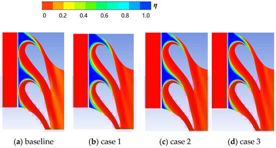 where is the area of the endwall where η > 0.1 and is the area of the endwall from the slot exit to the trailing edge of the vane. The results suggest that the case with slot fillet obtains larger coolant coverage than that of the case without the slot fillet. The case 1 achieves the largest overall adiabatic cooling effectiveness in comparison with the baseline due to the uniform film cooling coverage. The results indicate that case 1 achieves a 42% higher effective cooling area in comparison with the baseline. Compared with case 1, case 2 and case 3 have less effect on improving the adiabatic cooling effectiveness.