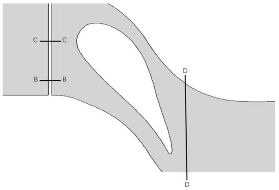 In the calculation, nine film holes are embedded in the endwall, like that displayed in Figure 20. The film holes are situated on an arc that is offset by a distance W from the blade profile. W is defined as 4% of the vane height. The film holes are equally spaced with an L = 57 mm distance between them. The diameter of the film holes is 4.6 mm and the film hole is in the same plane as the meridian surface. Figure 21 illustrates the relative position of film holes and fillet in Section D. In the calculation, MFR is 0.5%, and the blowing ratio M of the film hole coolant is set as 1.