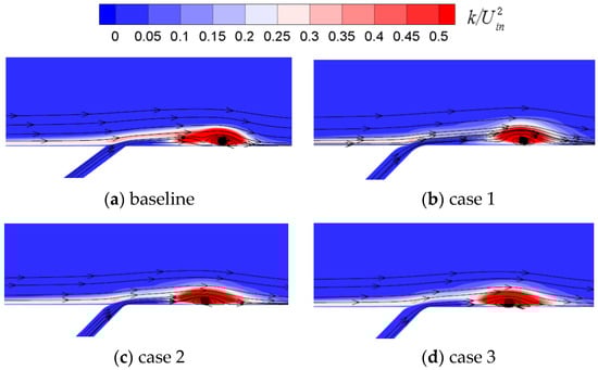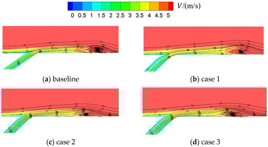 As shown in Figure 10, section B passes through the stagnation point. Section C is through the midpoint of two stagnation points. The two-dimensional streamline and turbulent kinetic energy distributions in section B are depicted in Figure 11. It is demonstrated that in case 1, the horseshoe vortex moves downstream. Meanwhile, the horseshoe vortex is drastically reduced in comparison with the baseline. The velocity distribution in section B is displayed in Figure 12. In case 1, the fillets with the same radius accelerate the boundary layer flow by changing the flow velocity. The slot fillets change the speed direction of the coolant near slot outlet, making the direction of the coolant more consistent with the mainstream. Therefore, the horse vortex moves downstream, leading to an expansion of the coolant coverage. In addition, the velocity at the slot outlet in case 2 and case 3 is lower than that in case 1. The velocity of the downstream boundary layer fluids in case 2 and case 3 is lower.