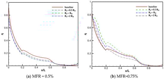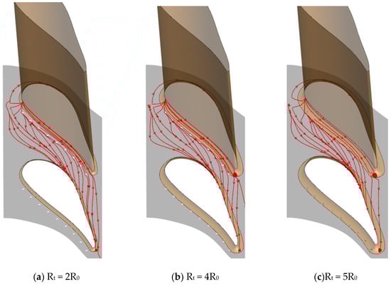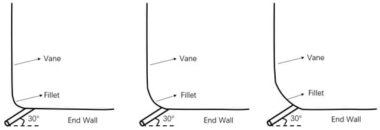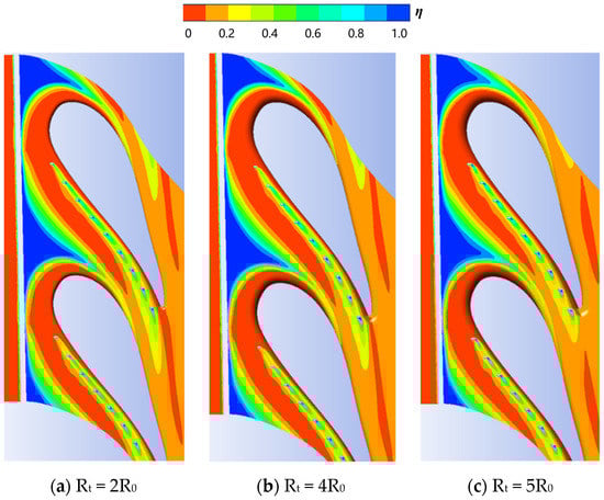 Due to the limit of machining technology, rounded corners are unavoidable at the intersection of two walls, such as at the vane root. Therefore, the impact of the vane root fillet on the cooling performance of the endwall is examined in this section. The model is displayed in Figure 13. The vane root fillet radius is defined as Rt, and 1% of the vane height is defined as R0.