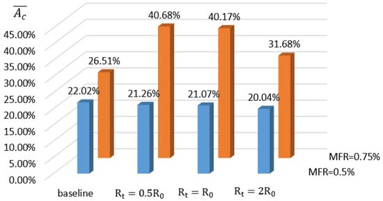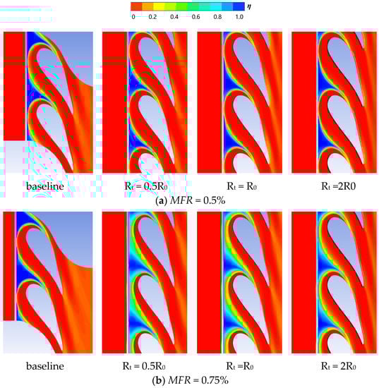 Figure 15 illustrates the adiabatic cooling effectiveness on the endwall and Figure 16 shows the dimensionless effective cooling area. From the results, it is obvious that MFR has a significant influence on the cooling performance of the endwall. The coverage of the coolant at the endwall is uneven. The slot coolant is confined to a narrow area downstream and there is a clear tendency to migrate towards the suction surface side. Therefore, the cooling flow has poor coverage of the leading-edge regions and the endwall near the pressure surface. The increase in MFR significantly improves the coverage area of the slot coolant. At MFR = 0.5%, the adiabatic cooling effectiveness near the leading edge is reduced by the introduction of the fillet. However, at MFR = 0.75%, the uncooled area near the leading edge and the pressure side is significantly limited by the introduction of the fillet, with a 53% increase in effective cooling area compared to the baseline. For the cases of Rt = R0 and 0.5R0, the coverage area of the coolant is increased slightly compared with the baseline.