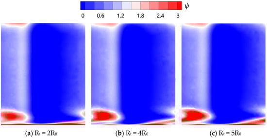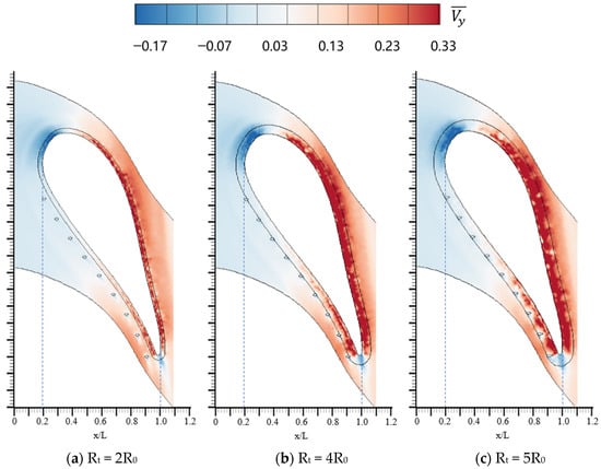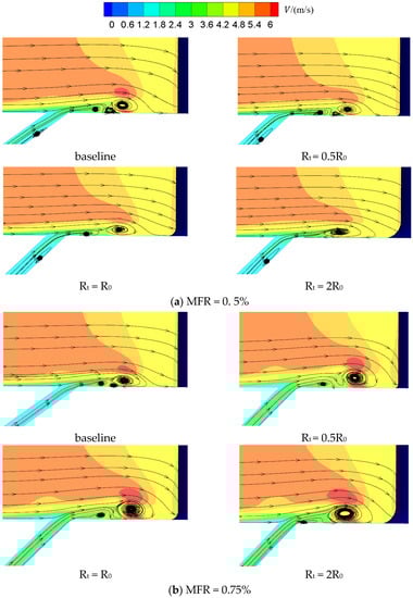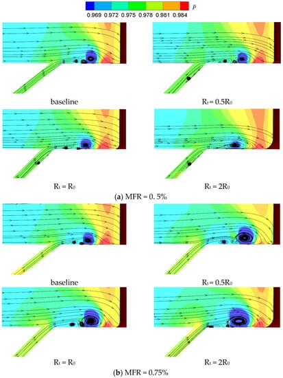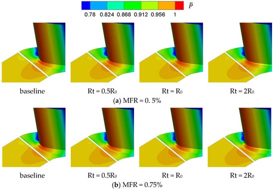 As the static pressure coefficient distributions in section C show in Figure 18, there are a large low-pressure area upstream of the horseshoe vortex and a high-pressure area close to the leading edge. Both of them contribute to the stagnation of flow near the leading edge. At MFR = 0.5%, the high-pressure region near the leading edge slightly shrinks at a large radius (Rt = 2R0). However, the increase of the fillet radius makes the boundary layer flow separate in advance. At MFR = 0.75%, increasing the fillet radius enlarges the high-pressure area near the leading edge and the low-pressure area upstream. Therefore, the area affected by the horseshoe vortex migrates upstream, greatly reducing the coolant coverage.