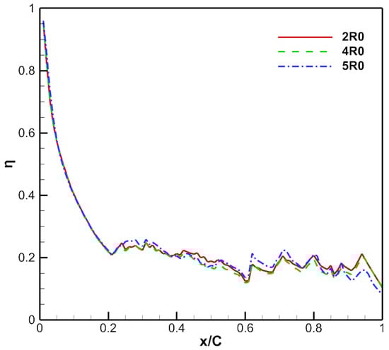 Figure 22 depicts the adiabatic cooling effectiveness distributions on the endwall, and Figure 23 shows the transverse average adiabatic cooling effectiveness of the endwall. The film hole coolant has great streamwise coverage, attaining a great cooling performance on the pressure side of the endwall. However, the film hole coolant has little influence on the cooling performance of the upstream and other mainstream regions. Although the film holes are close to the vane, there are still narrow high temperature regions without the coverage of the film hole coolant. The film hole coolant is slightly influenced by the mainstream vortex system. Therefore, the cooling performance of the film hole coolant is more effective in comparison with the slot coolant. In addition, the cooling area of the upstream film hole coolant can cover the downstream film hole. In the downstream passage, the film hole coolant still has great coverage. In addition, the film hole coolant has a strong lateral coverage, resulting in great overall adiabatic cooling effectiveness. The increase of the fillet radius significantly improves the transverse expansion of the film hole coolant. However, the streamwise coverage area of the film hole coolant near the vane trailing edge decreases.